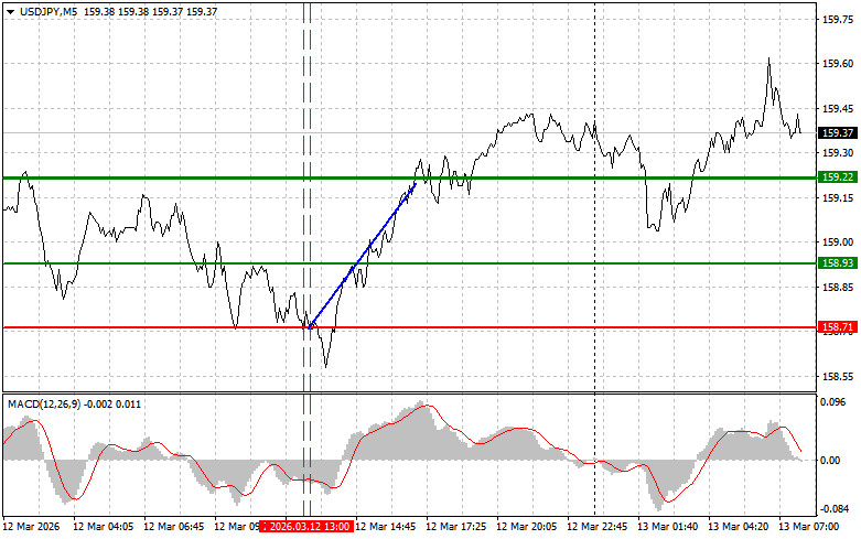 পরিকল্পনা #2: আজ MACD সূচকটি ওভারসোল্ড জোনে থাকাকালীন সময়ে মূল্য পরপর দুইবার 159.28-এর লেভেল টেস্টের ক্ষেত্রে আমি USD/JPY পেয়ার কেনার পরিকল্পনা করছি। এটি এই পেয়ারের মূল্যের নিম্নমুখী হওয়ার সম্ভাবনাকে সীমিত করবে এবং মূল্যকে বিপরীতমুখী করে ঊর্ধ্বমুখী দিকে নিয়ে যাবে। আমরা 159.53 এবং 159.91-এর বিপরীতমুখী লেভেলের দিকে এই পেয়ারের দর বৃদ্ধির প্রত্যাশা করতে পারি।