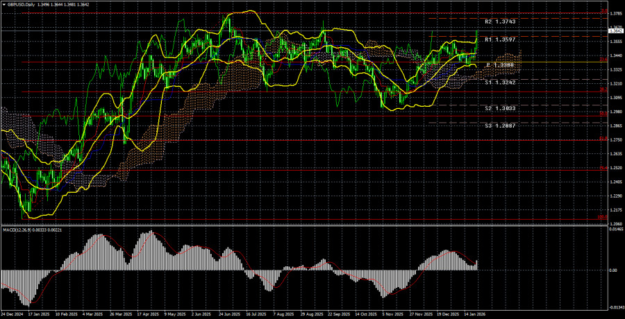 Отношение имеют все те же глобальные факторы, о которых мы говорим уже целый год. Если бы во второй половине 2025 года британский фунт продолжал расти, мы бы совершенно не удивились. Однако время от времени рынку нужно корректироваться, а на дневном ТФ коррекции занимают достаточно много времени. Поэтому мы наблюдали фактически пятимесячную коррекцию. Следует помнить, что в большинстве случаев коррекция имеет под собой исключительно технические основания. Часть трейдеров начинает фиксировать прибыль, поэтому мы наблюдаем откат, который, как правило, противоречит фундаментальному и макроэкономическому фону. Напомним, что во второй половине прошлого года мы неоднократно ставили под сомнение закономерность падения пары GBP/USD.