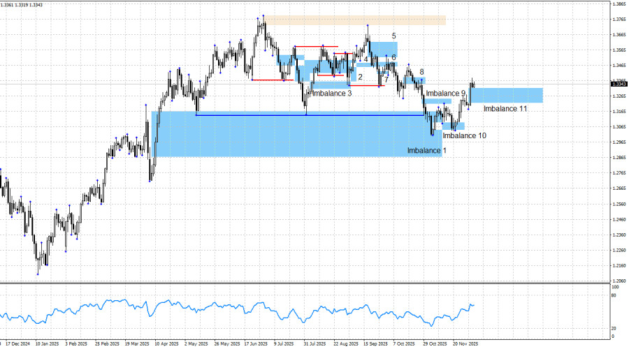 Графическая картина сейчас следующая. «Бычий» тренд может быть завершен, но «бычий» тренд по европейцу – совершенно точно не завершен. Таким образом, европейская валюта может вытянуть фунт «с того света». Быки оттолкнулись от «бычьего» имбаланса 1, от «бычьего» имбаланса 10, что придало им в конечном счете сил и уверенности в своих действиях и своей правоте. Вчера был образован еще один «бычий» имбаланс – 10, от которого цена может получить реакцию уже сегодня. Вероятно, заход в этот имбаланс будет более глубоким и понадобится несколько дней, чтобы зайти и выйти из него. Но отработка может быть также и очень краткой, быстрой. В любом случае, начиная с текущего момента, «бычий» сигнал может быть образован в любой момент.