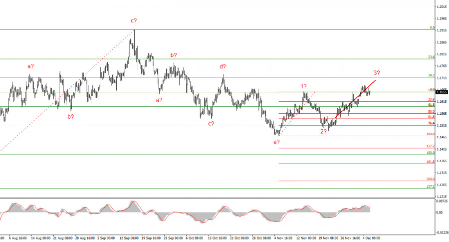 На мой взгляд, построение повышательного участка тренда не завершено, а его цели разбросаны вплоть до 25-й фигуры. Серия волн a-b-c-d-e выглядит завершенно, следовательно, я в ближайшие недели ожидаю построения нового повышательного набора волн. Мы увидели предполагаемые волны 1 и 2, а сейчас инструмент находится в стадии построения волны 3 или с. Я ожидаю, что в рамках этой волны инструмент повысится минимум до отметки 1,1717, что приравнивается к 38,2% по Фибоначчи. Не исключаю также сценария, при котором повышательный набор волн примет пятиволновой вид.